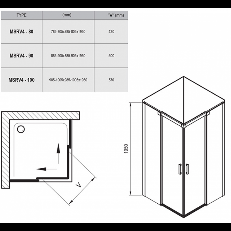 Изделие состоит из двух ровных неподвижных частей и двух ровных подвижных частей, образующих раздвижные двери. Устанавливается в облицованный кафелем угол ванной комнаты на поддоны RAVAK Perseus Pro Chrome или непосредственно на пол со встроенным душевым каналом.