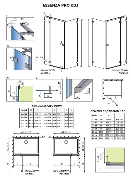 Essenza Pro — коллекция кабин разных форм, дверей и шторок, в которых стационанрое стекло закреплено к стене с помощью кронштейна, а не профиля. Допустимы два варианта монтажа: с уплотнительным профилем, или без него. Створка двери подвешена на латунных петлях и открывается только наружу.