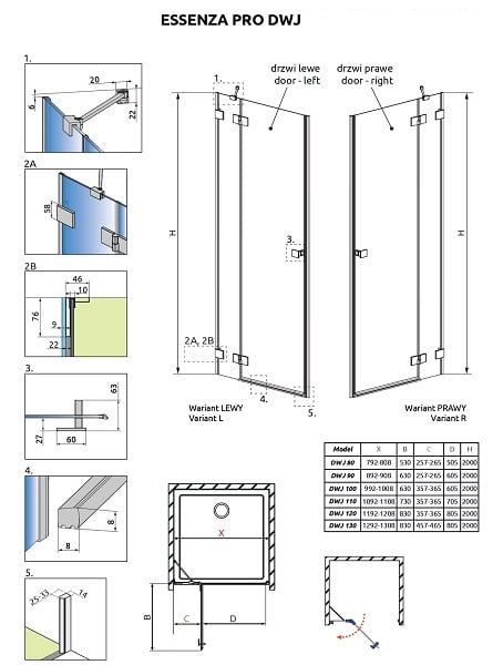 1) Душевые двери Radaway Essenza Pro White DWJ 110 правосторонние белый/прозрачное стекло