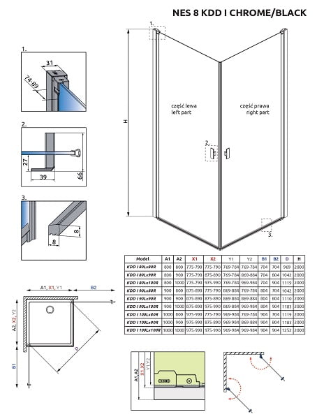 Коллекция Nes это одна из самых универсальных и многообразных коллекций душевых кабин, дверей и шторок. Створки двери в этой коллекции открываются и внутрь и наружу. Профили и фурнитура на выбор либо в цвете «хром», или «Black». Толщина стекла 6 или 8 мм. По стандарту стекло прозрачное или Frame/Factory. Под заказ есть доступны другие варианты цветов стекол.