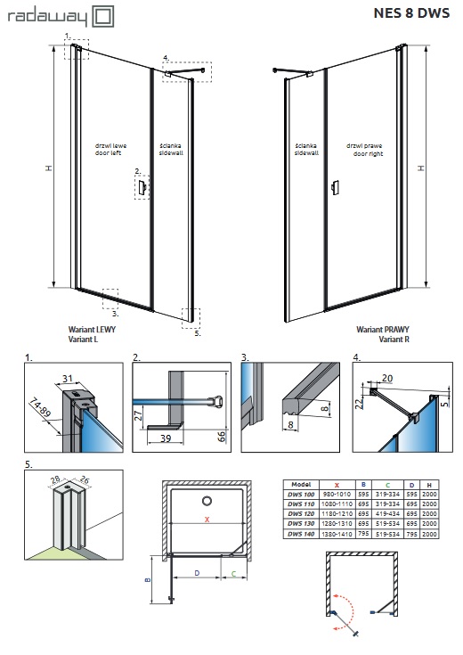 1) Душевые двери Radaway Nes 8 DWS 69,5 правосторонние хром/прозрачное стекло