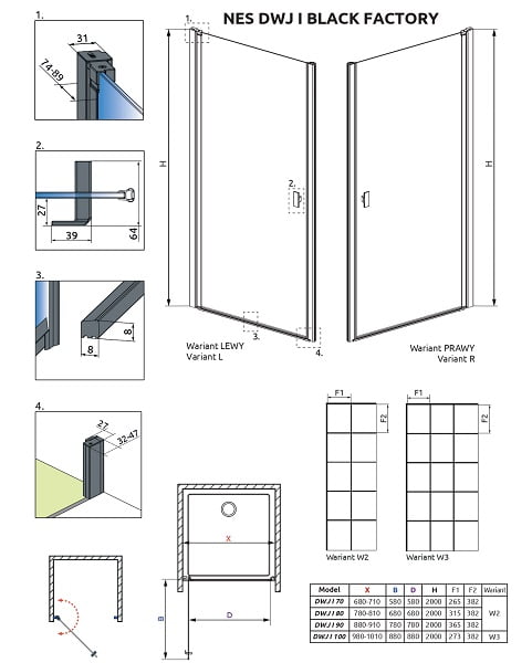 1) Душевые двери Radaway Nes Black DWJ I Factory 90 правосторонние черный/стекло Factory