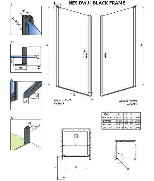 Душевые двери Radaway Nes Black DWJ I Frame 70 правосторонние черный/стекло Frame