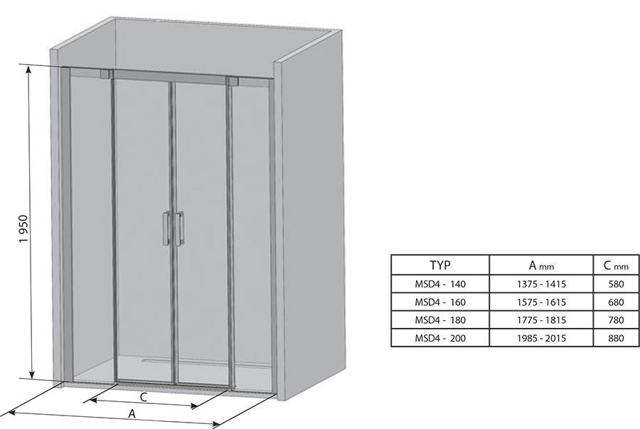 Изделие состоит из двух неподвижных и двух раздвижных частей - дверей. Монтируется в облицованной плиткой ванной комнате (в кирпичной нише) прямо на полу со встроенным душевым каналом или трапом.