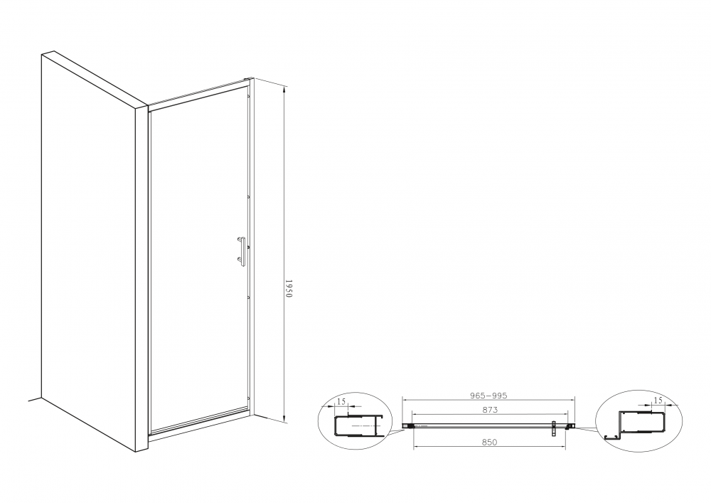 1) Дверь душевая одностворчатая Roca Town 100х195 профиль алюминий хром прозрачное стекло