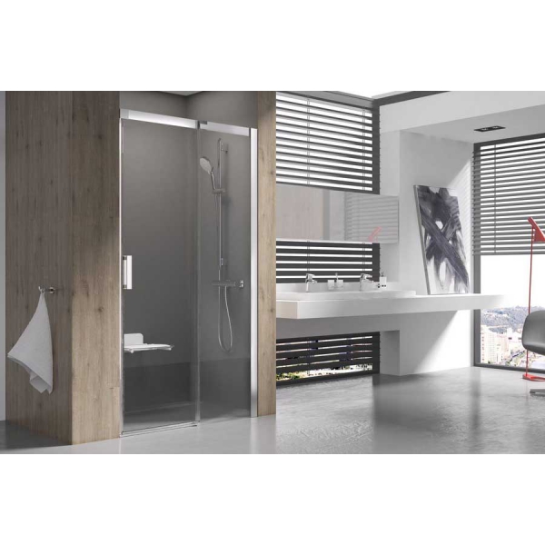 Роскошные раздвижные двери для Вашей ниши. Сделают герметичным душевое пространство шириной до 120 см. С помощью массивных профилей, верхнего и бокового, которые подчеркивают декоративные квадратные накладки, душевые двери придадут Вашей ванной комнате особый стиль.