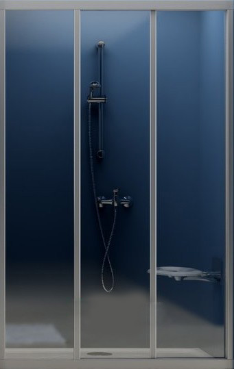 - душевые двери состоят из одной неподвижной части и двух подвижных частей.