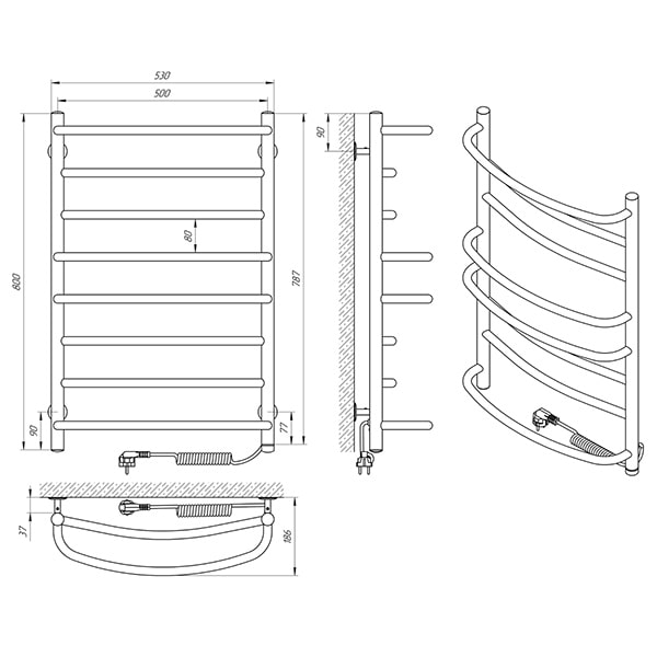 При включении полотенцесушителя в электрическую сеть засветится и погаснет подсветка, что сигнализирует об исправности регулятора. Регулятор S3 имеет три режима работы min, mid, max, которые переключаются кратковременными касаниями. Сенсор размещен на конце нижней стойки с регулятором.