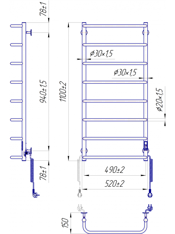 Инновационная система - коннектор (подключение к розетке). Вместо привычного шнура с фиксатором в конструкции изделия присутствуют разъемы на обеих стойках, позволяющие подключить полотенцесушитель к сети с любой стороны.