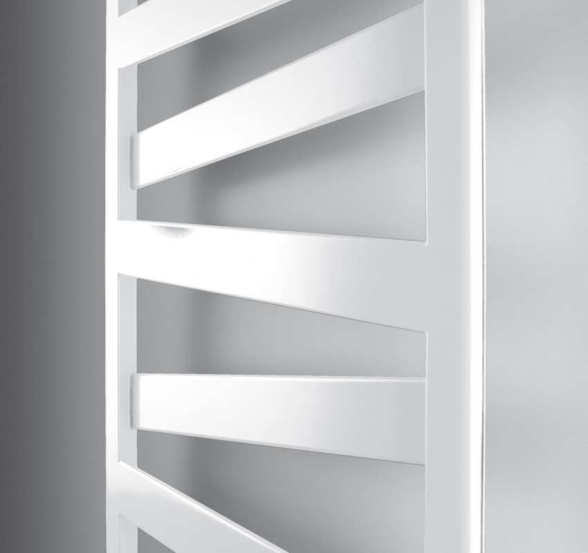 Дизайнерский полотенцесушитель Zehnder Kazeane выделяется своей неординарностью и экстравагантностью. Несмотря на ассиметричное диагональное расположение плоских труб, если присмотреться, вы увидите одну или две горизонтальные, в зависимости от высоты радиатора, для удобного развешивания полотенец.