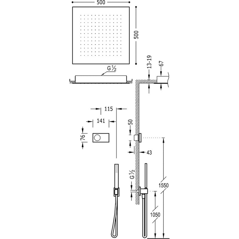 - Встраиваемый потолочный душ INOX 500х500 мм