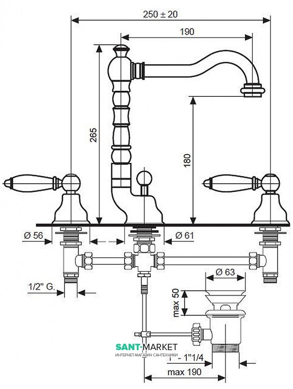 Смеситель для раковины двухрычажный с донным клапаном высокий EMMEVI Deco Ceramic бронза BR121643