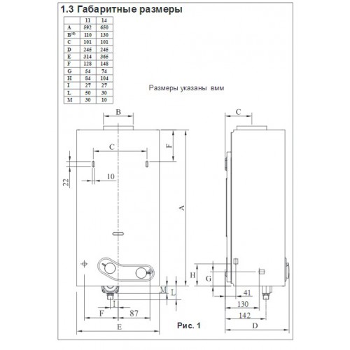 - Номинальная мощность водонагревателя обеспечивается при давлении газа на входе 130 ммВст