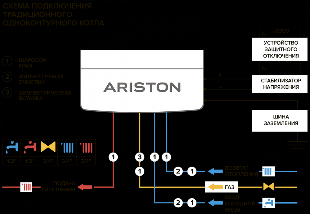 - Встроенные фильтры в контурах отопления и подпитки для защиты котла от примесей в воде