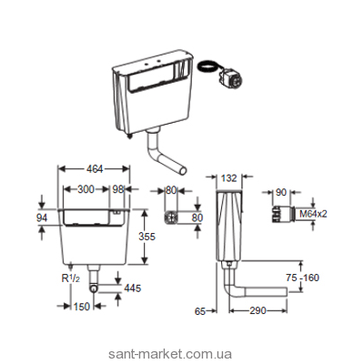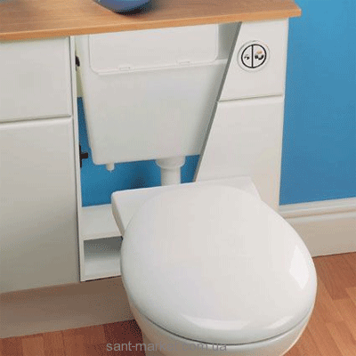 Бачок скрытого монтажа и малой высоты для установки в мебель, двойной смыв, с пневматической смывной клавишей. Пневматический привод смыва. Подключение к системе водоснабжения снизу слева. Объем воды для смыва, заводская установка 5,8 и 3 л.