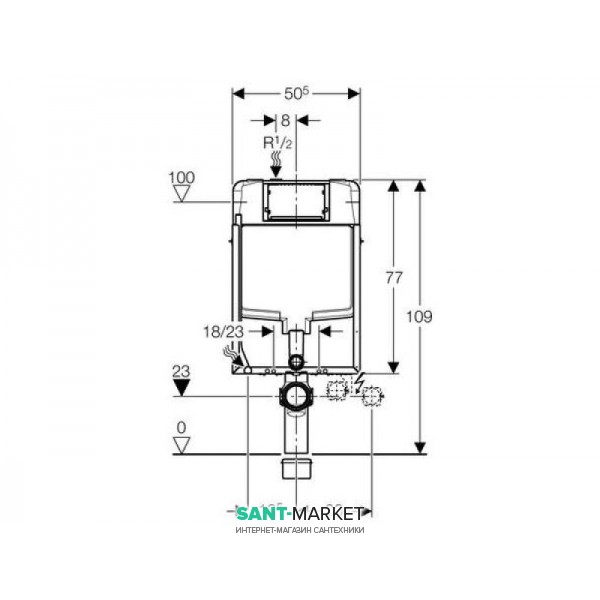 - подключение к системе водоснабжения R 1/2 со встроенным угловым запорным вентилем и ручным маховичком