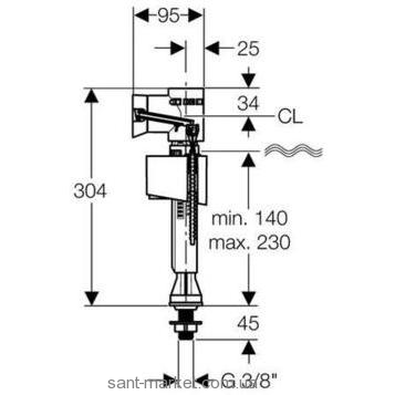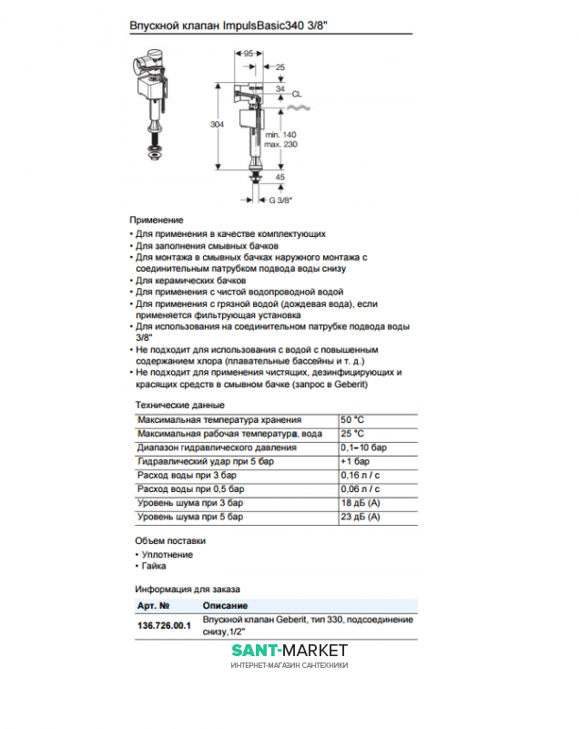 Запасной впускной клапан Geberit Impuls330 3/8 подвод воды снизу 136.753.00.1