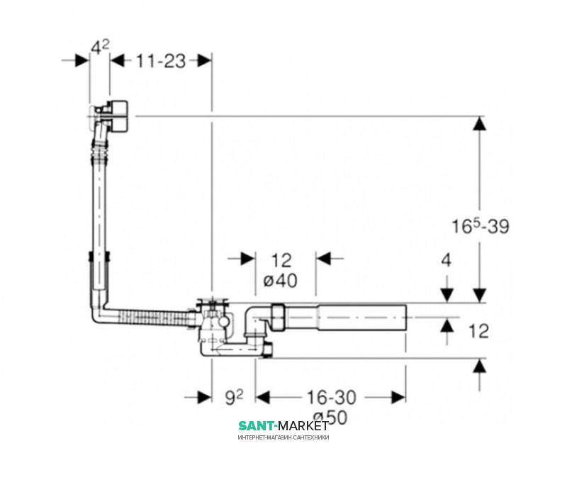 Сифон для ванны Geberit подвод воды через слив-перелив 150.710.21.1