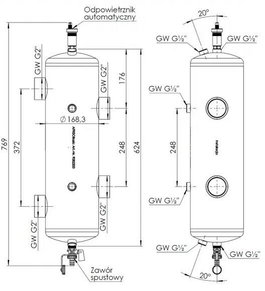 Версия BLH до 200 кВт изготовлена из корпуса из оцинкованной стали с внутренней сеткой, двухслойной изоляцией из пенополиуретана (XLPE), погружной втулкой для установки датчика температуры, G½”, автоматическим воздухоспускным клапаном с краном KFE и двумя термометрами. Гидравлическую муфту BLH мощностью до 200 кВт подключить к системе отопления с использованием внутренней резьбы G2. Если вы не используете дополнительное оборудование, отверстия должны быть закрыты с помощью заглушки G 1/2.