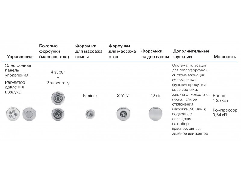 2 супер – ролли форсунки для массажа тела (создают сильное завихрение, что позволяет получить максимально сильный массаж на большой области тела)
