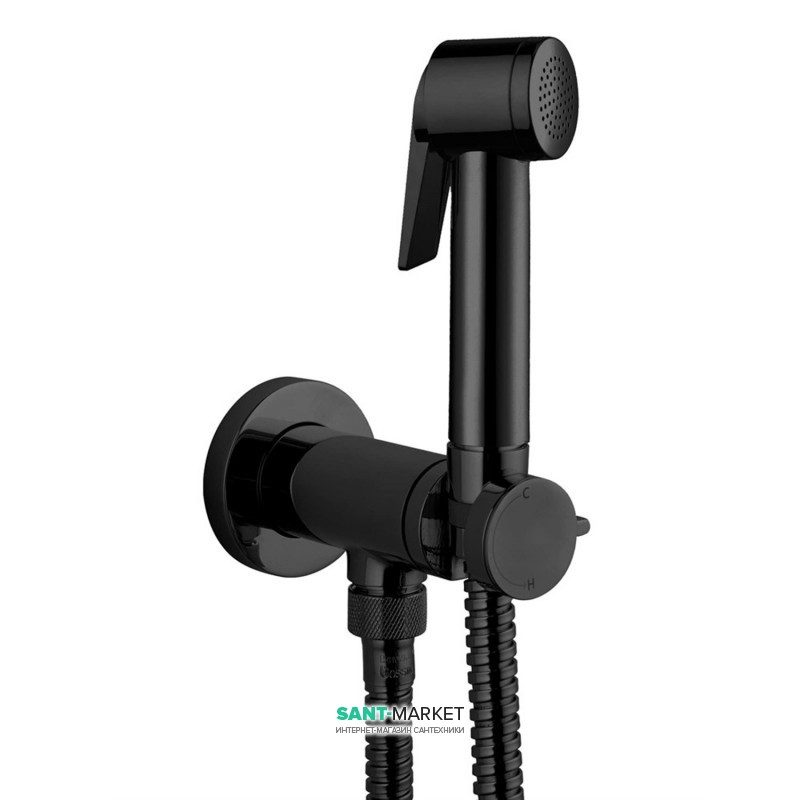 Черный смеситель с гигиеническим душем Bossini Paloma Flat Mixer Set Италия встроен в единый корпус с подключением для гибкого шланга и держателем лейки.