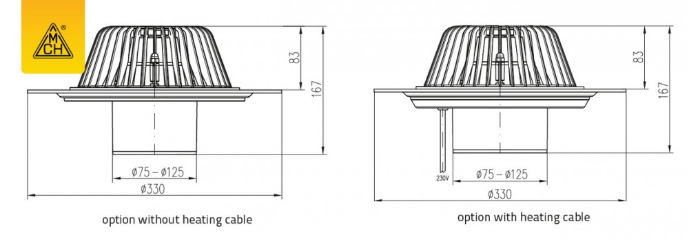 Подогрев воронки происходит с помощью саморегулирующегося кабеля, предупреждает замерзания выпуска.