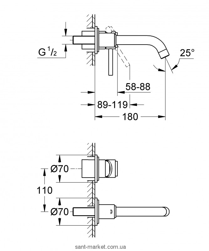Смеситель для раковины однорычажный настенный скрытый Grohe коллекция Atrio хром 19287001
