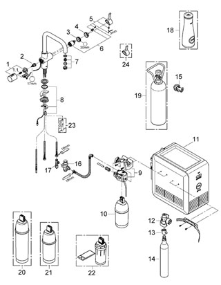 Эксплуатация однорычажного смесителя возможна с накопителями, работающими под давлением, прямоточными водонагревателями с термическим управлением, прямоточными водонагревателями с гидравлическим управлением. Эксплуатация с безнапорными накопителями (открытые водонагреватели) не предусмотрена! Смеситель GROHE Blue® Chilled & Sparkling с встроенным охладителем-карбонизатором разработан для личного пользования, а не для применения в производственных целях.
