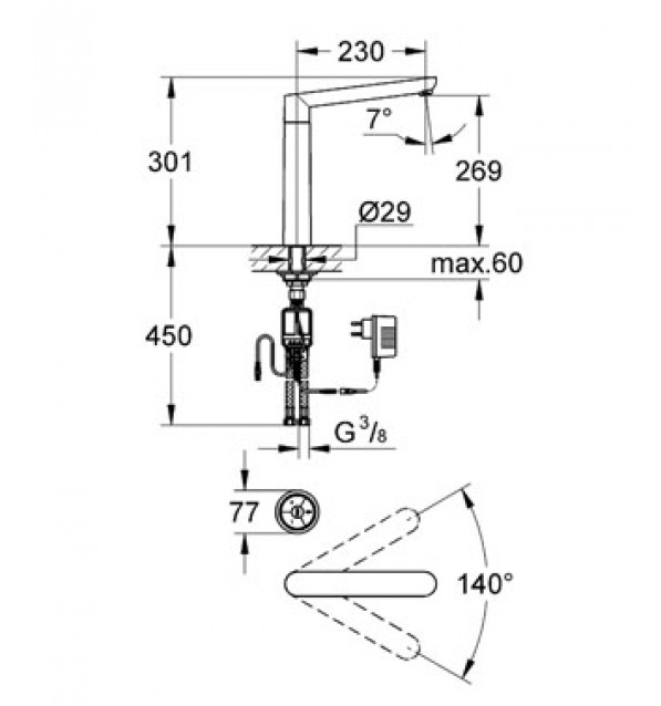 Электронную панель управления можно установить в любом месте, что повышает свободу проектирования. Данная модель оснащена LED индикатором, который меняет цвет в зависимости от температуры воды, что повышает удобство и безопасность использования. Литой излив с углом поворота 140 градусов увеличивает радиус действия смесителя, а аэратор насыщает воду кислородом, что делает струю более мягкой и объемной.