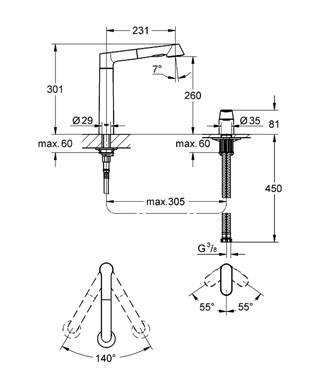 - область поворота 140°