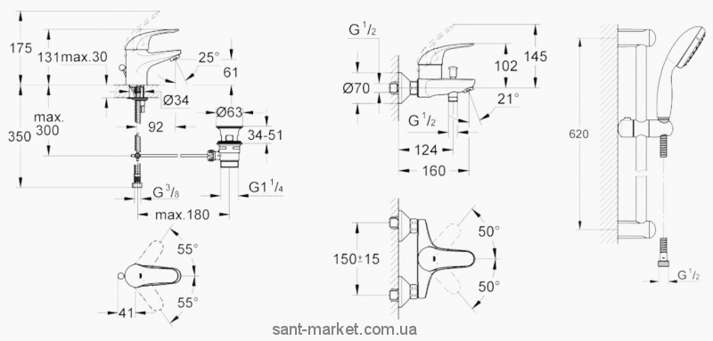 Состав набора: Смеситель для раковины, Смеситель для ванны, Ручной душ, Штанга