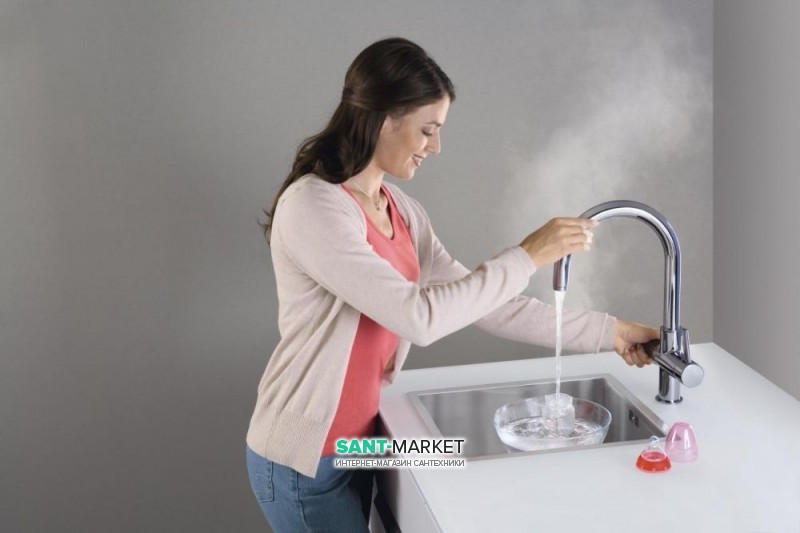 Мгновенная подача кипящей воды со смесителями Grohe Red. Раньше Вам потребовалось бы вскипятить ее в кастрюле или чайнике, а теперь ее можно просто налить из вашего кухонного смесителя. Прогрессивная бойлерная система поддерживает в кипящем виде от трех до шести литров воды (в зависимости от модели бойлера), в любое время готовых к использованию.