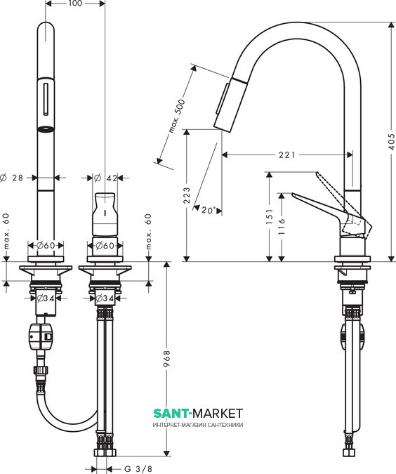 Смеситель для кухни с выдвижной лейкой Hansgrohe Axor Citterio M на два отверстия 34822800