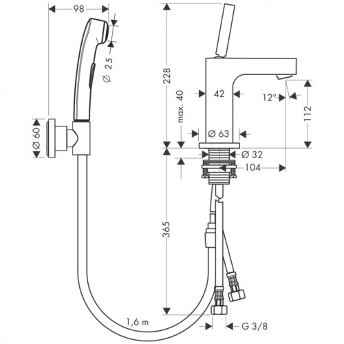 - гигиенический душ с держателем (#39525000) и шлангом Isiflex 1,60 м (# 32128000)