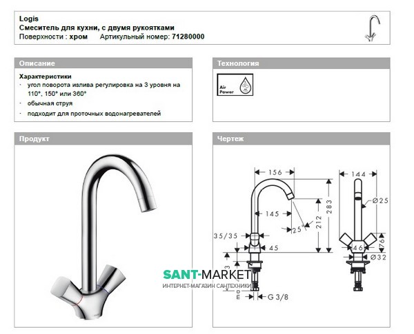 Описание смесителя для кухни Hansgrohe Logis (71280000)
