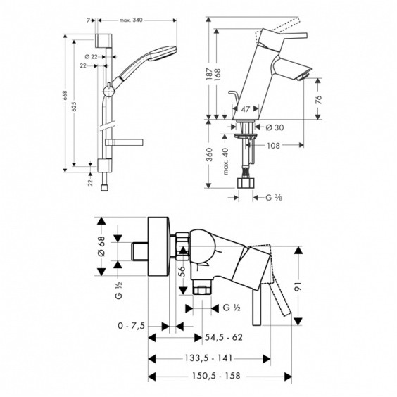 смеситель для умывальника Talis S2 (32040000); смеситель для душа Talis S2 (32640000); ручной душ Croma 100 Vario/Unica в комплекте с душевой стойкой длиной 65см.