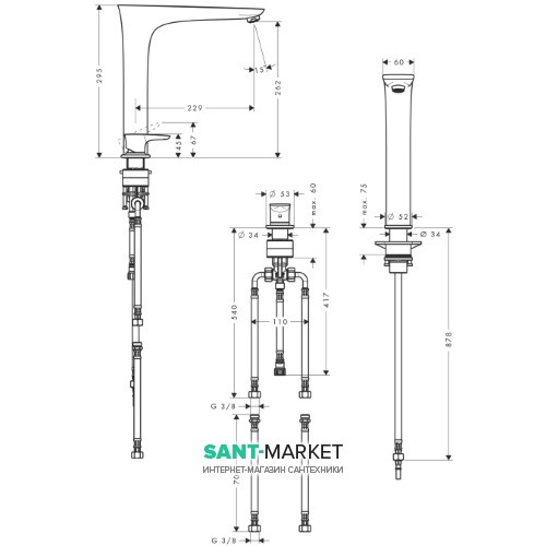 - 2 x 700 мм удлинительные шланги для подачи холодной и горячей воды, 1 x 300 мм удлинительные шланги для соединения смешанной воды