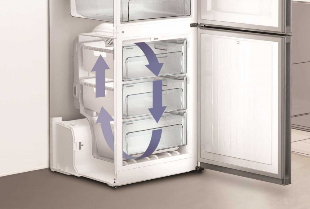 Технология NoFrost от Liebherr не требует размораживания холодильно-морозильной комбинации и создает необходимые условия для сохранения свежести продуктов на длительное время. Замораживание происходит в результате циркуляции охлаждённого воздуха с помощью вентилятора, возникающая влага выводится из устройства.