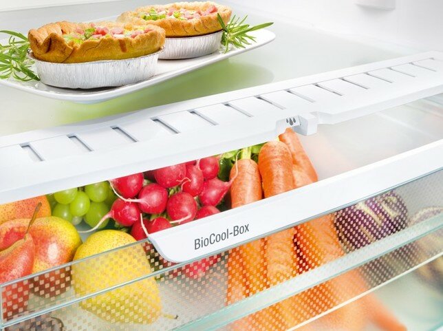 Отделение BioCool позволяет регулировать уровень влажности в холодильном отделении для увеличения свежести овощей и фруктов. Для лучшего обзора и удобной эксплуатации контейнеры установлены на специальные ролики или телескопические направляющие. Установка уровня влажности осуществляется с помощью специального регулятора.