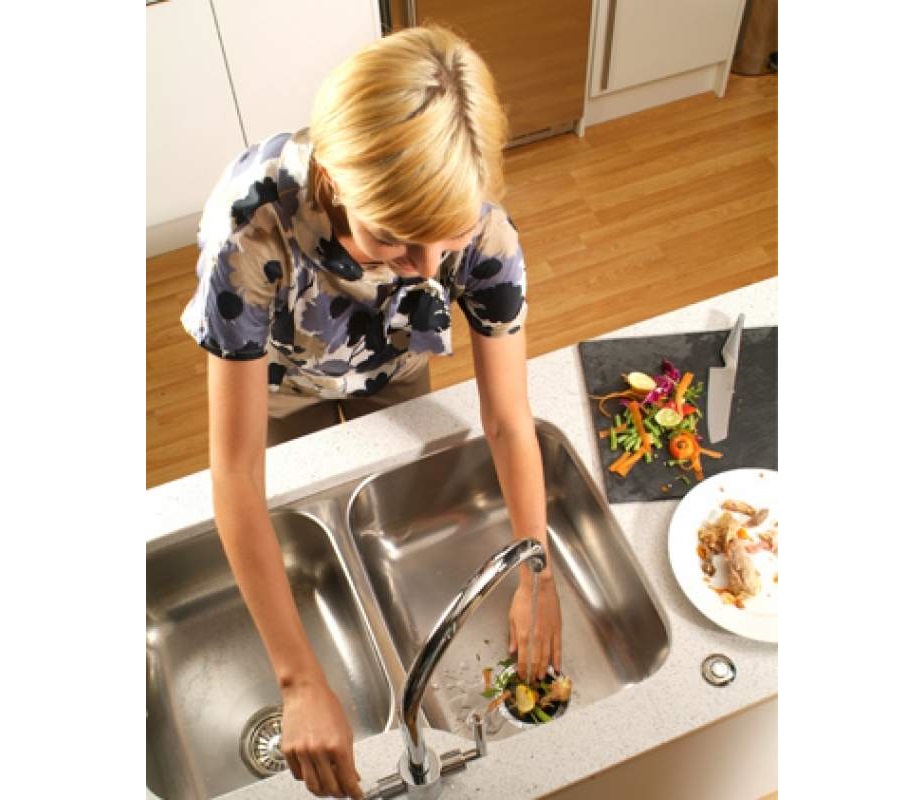 Измельчители пищевых отходов InSinkErator, аккуратно установленные под раковиной, легко перетирают пищевые отходы в мелкие частицы, которые можно смывать в канализацию для переработки на местной станции очистки сточных вод.