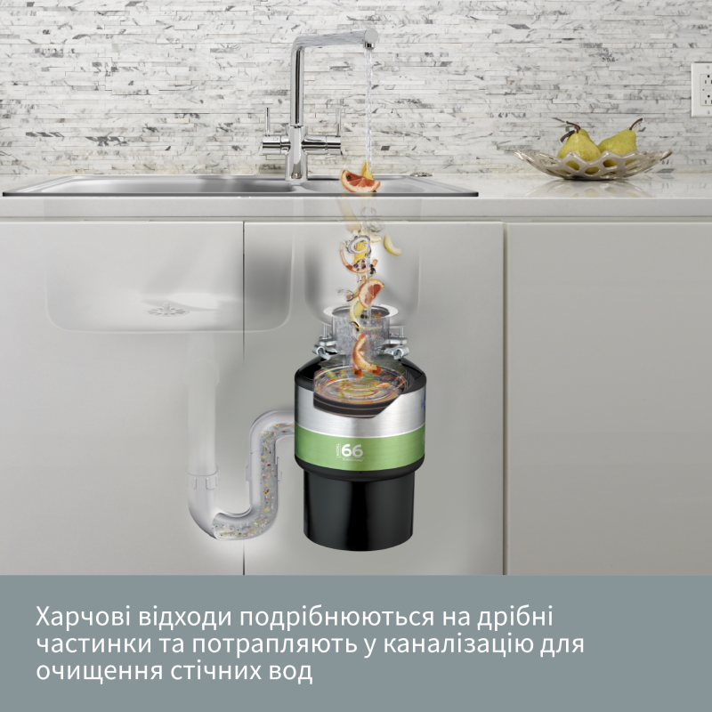 Измельчители пищевых отходов InSinkErator, аккуратно установленные под раковиной, легко перетирают пищевые отходы в мелкие частицы, которые можно смывать в канализацию для переработки на местной станции очистки сточных вод.