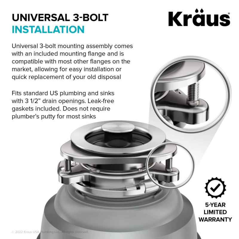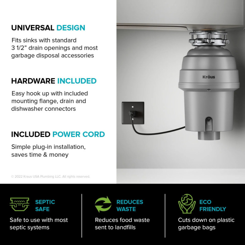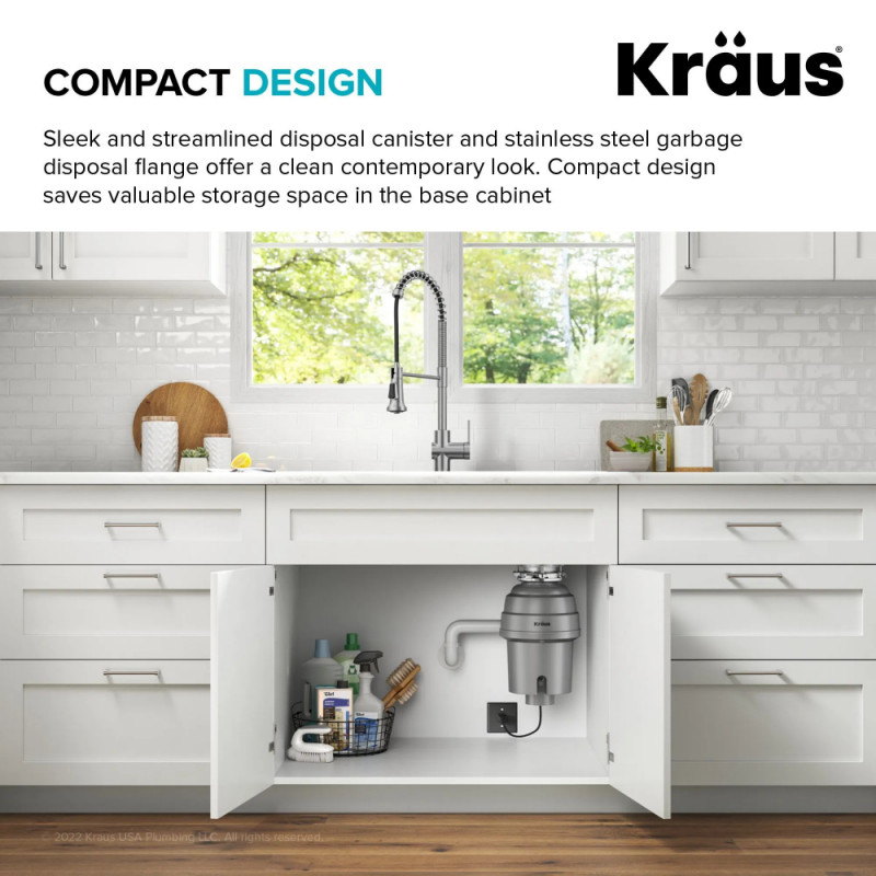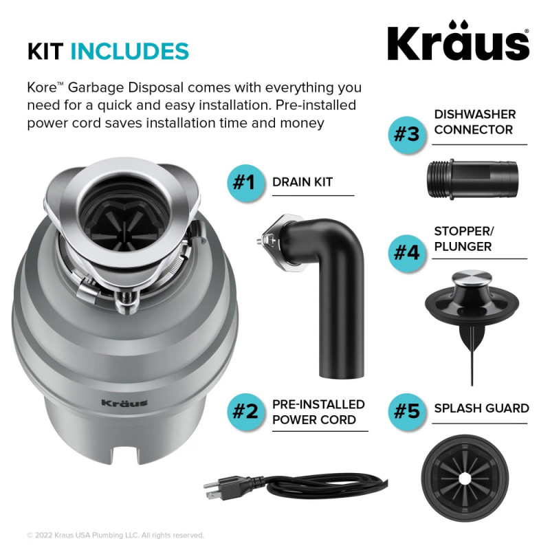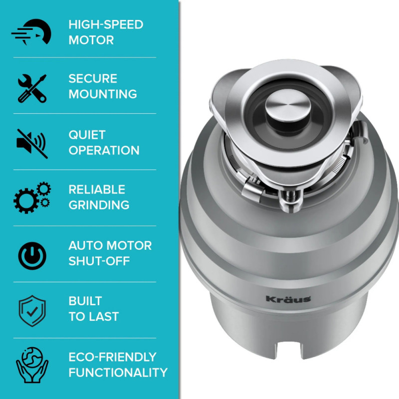 МОЩНАЯ ПРОИЗВОДИТЕЛЬНОСТЬ: KRAUS® Kore™ Garbage Disposal обеспечивает быстрое и надежное измельчение повседневных пищевых отходов – идеальный выбор для домовладельцев, которые регулярно пользуются кухней и хотят, чтобы уборка была быстрой и простой.