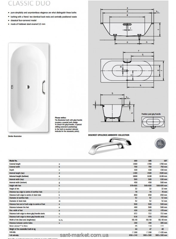 Простота линий и скромная элегантность стальных ванн Classic Duo не оставят вас равнодушными. Обе боковины сделаны с удобным изгибом и углом наклона, что позволяет принимать ванну вдвоем. Габариты изделия позволяют эффективно использовать пространство помещения. Все ванны имеют гладкую белоснежную поверхность, а толщина запатентованного материала сталь-эмаль составляет 3,5мм. Сталь-эмаль 3,5 мм от Kaldewei сочетает крепкую сталь и прочное стекло и образует единое соединение, объединяющее силу обоих материалов в крепкий материал сталь-эмаль. Kaldewei вот уже почти столетие непрерывно совершенствует, улучшает, оптимизирует «секретную формулу» и процесс производства сталь-эмали 3,5 мм, что гарантирует долговечность, которая остается видимой, осязаемой и неподверженной воздействию времени.
