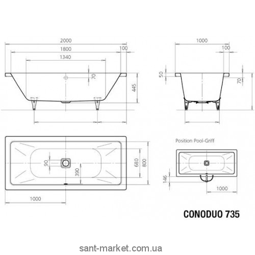 Классическая прямоугольная стальная ванна Kaldewei Conoduo 200x100 с толщиной стенок 3.5 мм.