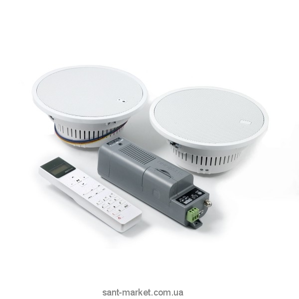В комплекте: радиомодуль с усилителем, 2 х 5" потолочных динамика со встроенным ИК приемником, пульт ДУ с экраном и с настенным креплением , аудиокабеля, антенна.