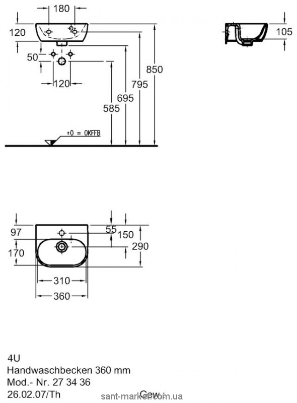 Керамический умывальник прямоугольной формы. Размеры: 360x290x120 мм. Глубина чаши: 105 мм. Монтаж на кронштейнах. Перелив. Отверстие под смеситель.