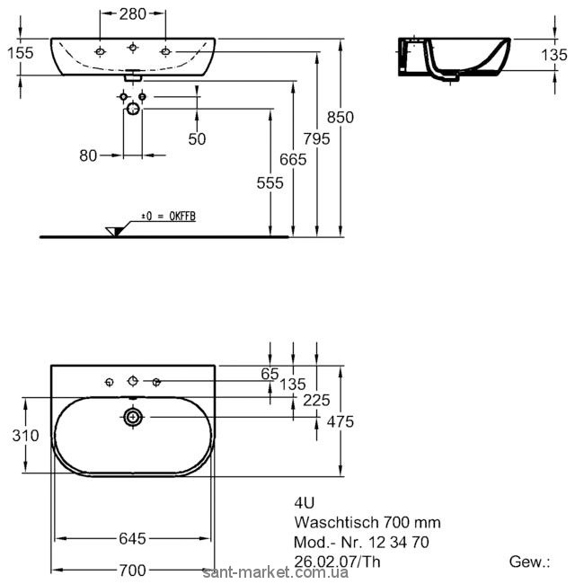 Керамический умывальник прямоугольной формы. Размеры: 700x475x155 мм. Глубина чаши: 135 мм. Универсальный монтаж (Монтаж на кронштейнах, на пьедестале, на тумбе). Перелив. Отверстие под смеситель.