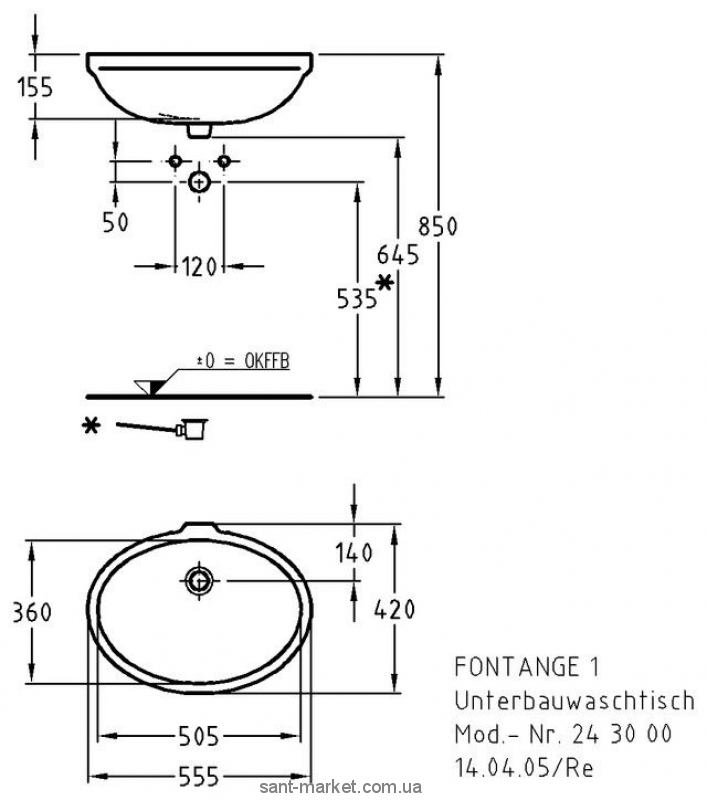 Keramag Fontange 243000 - врезная под столешницу раковина с переливом. Отверстие под смеситель отсутствует. Материал - санфаянс; цвет - белый.