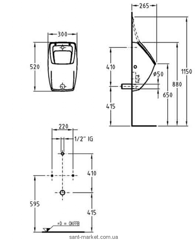 Писсуар подвесной размером 300 х 265 х 520 мм с задним подводом и отводом воды. Изготовлен из санфаянса. Дополнительно может быть укомплектован крышкой для писсуара, сифоном, инсталляцией или встроенным смесителем для писсуара, креплением. Вес 11,9 кг.
