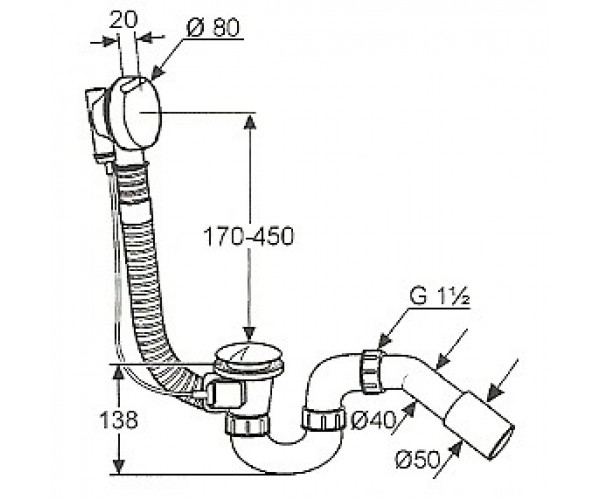 Сливная система для ванны с гибким шлангом 850 мм и переливной трубой 760 мм.